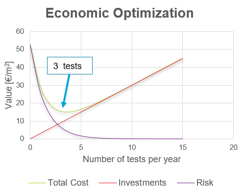 Assume the owner has decided to use the cheap paint system, and is simply going to sand it off (i.e. the cheap cleaning method) and re-apply the same system every year (i.e., for these problems consider a 1-year reference period). You have been asked to assess whether it is worthwhile to use a quick sonic test system to prevent failures during the year, and if it is, the number of tests that should be performed per year. Each test costs about €3 per m2, and if a weak spot is found, a new layer of paint can be easily applied, lowering the failure probability by a factor of 0.50.