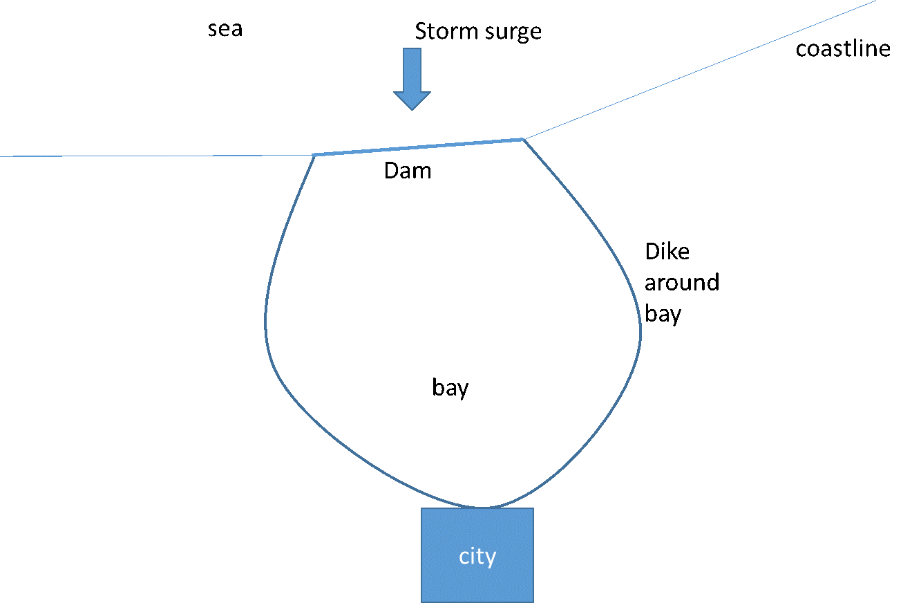 A flood protection system for an area at a bay consists of a first line of defence (a dam on the coast) and a second line (a dike around the bay) to protect the city against a storm surge that can cause a high water level in the bay. The design team considers two strategies: 1) a single dike around the bay, or 2) a dike around the bay plus a dam (see figure).
