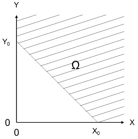 The shaded region, \(\Omega\), in the figure below is the failure domain of an unknown object (the shaded zone extends further towards positive infinity for \(x\) and \(y\)). \(p_f\) is the probability of failure of that object, such that: