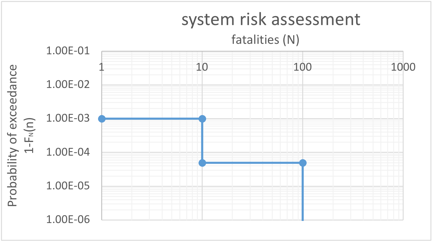 A full scale risk assessment is made for the system with probabilities \(P(N>10)=10^{-3}\) per year and \(P(N>100)=5 \cdot 10^{-5}\) per year. A so-called limit line is given with values with \(C = 10^{-1}\); and \(\alpha = 2\).