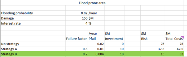 The damage in case of flood protection system failure is 1 billion \(10^9\) Euros. We compare two different investments in the system. In strategy 1 the system failure probability becomes \(10^{-3}\) per year at a cost of 10 million (\(10 \cdot 10^{6}\)). In strategy 2 the system failure probability becomes \(3 \cdot 10^{-4}\) per year at a cost of 50 million.