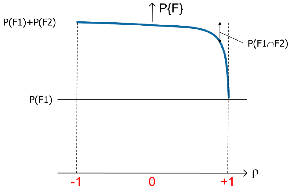 Fig. 4.4 quantifies the effect of dependence on the join probability of failure of two components. The joint failure probability is calculated using the multivariate normal distribution which has a linear dependence measure, the correlation coefficient, \(\rho\). The blue line shows the series system failure probability, equivalent to (4.1). The figure allows one to evaluate the quantitative effect of dependence on series and parallel systems, and even illustrates the bound of \(p_{f,sys}=P(F_1)\) for the case of \(\rho=+1\).