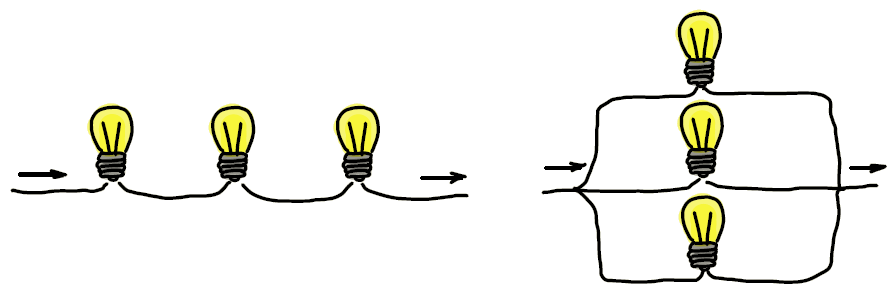 Fig. 4.3 Series (left) and parallel (right) systems illustrated as a string of lightbulbs.#