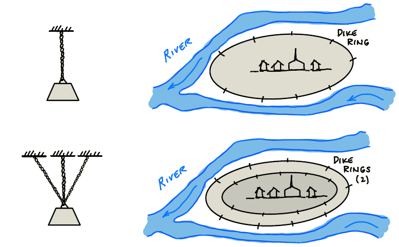 Within a series system, failure of a single component will always lead to the failure of the entire system. An example is a chain, which breaks if any individual link fails. In our flood management example, a dike ring protecting a single area that is made up of multiple segments is also a series system. Within a parallel system, failure of one component can be compensated by the performance of another component; it represents the concept of redundancy. Drawing on the chain example, it would imply using more than one chain capable of holding the maximum load. An example from flood management would be to build a second dike ring inside the first dike ring. In practice, a complex system can generally be represented by means of a combination of parallel and series subsystems, just as the parallel system of multiple chains (or dikes) is a parallel system of series systems of links (or dike segments).